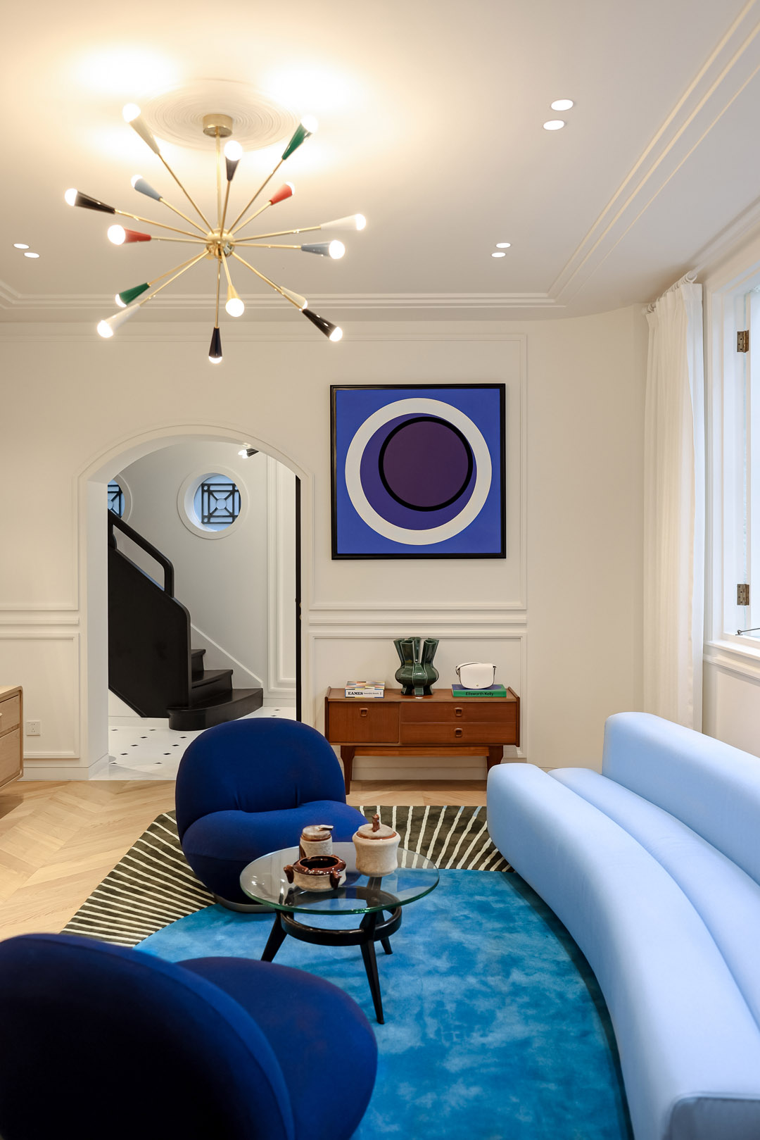 空间内部处处彰显法式生活艺术。鱼骨拼木地板与装饰线条复刻了巴黎奥斯曼风格的优雅气韵。一层的客厅以艺术与交流为主题,陈列着珍贵的珑骧历史藏品——赛道模型、烟灰缸、香烟分配器与烟草罐。法国现代设计大师Pierre Paulin的蓝色沙发成为视觉焦点,上方悬挂几何抽象先锋Geneviève Claisse的蓝色画作《H Luz》(1970),展现纯粹形态与色彩的和谐之美。