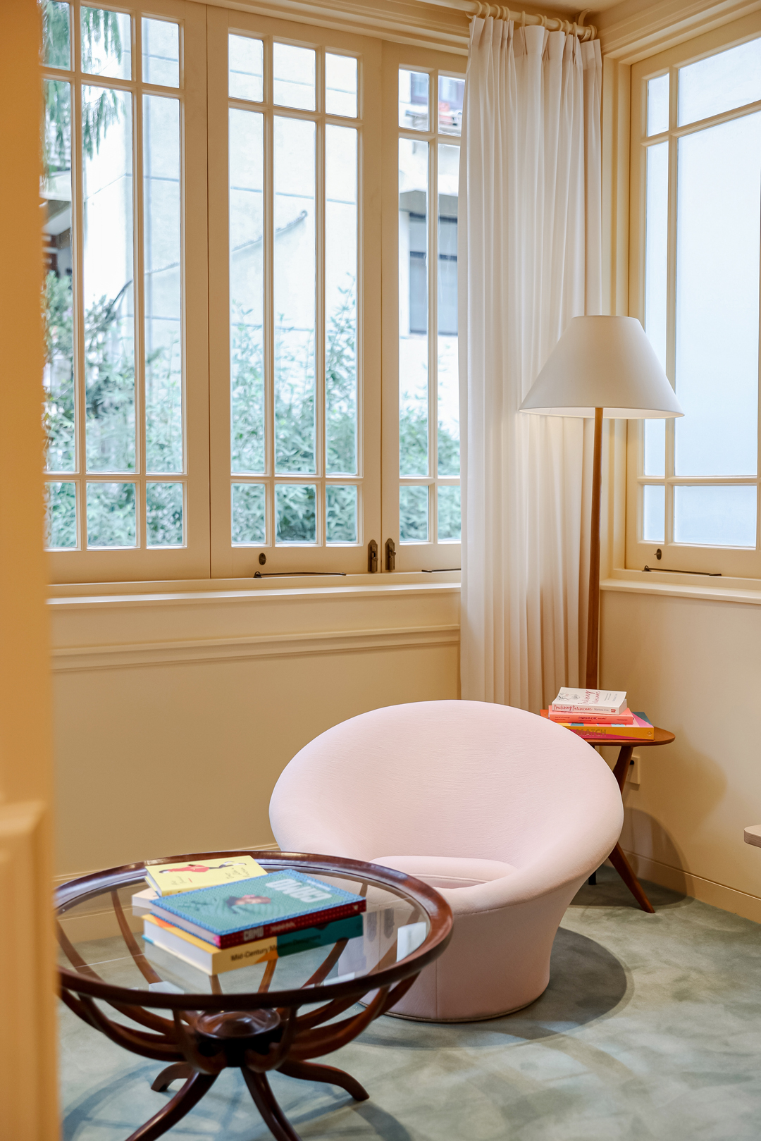 沐浴在阳光中的冬日花园,延展出一片静谧意境。两张由Pierre Guariche于1953年设计的扶手椅,以及Oscar Malessène的丙烯画作,带领客人在步入花园前于此小憩沉思,品味片刻宁静。