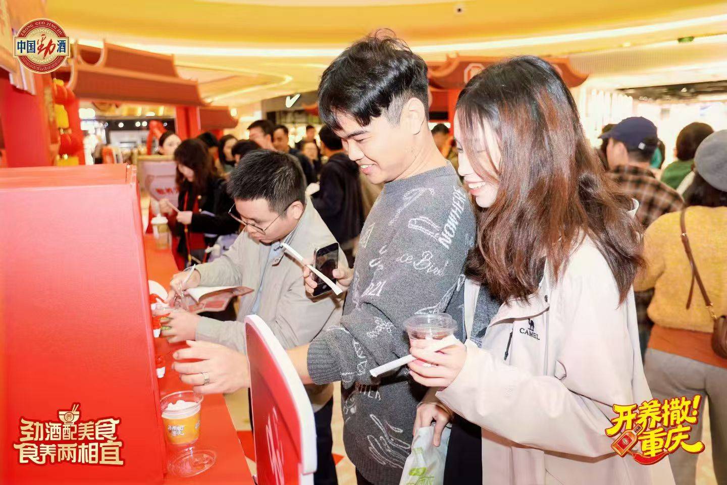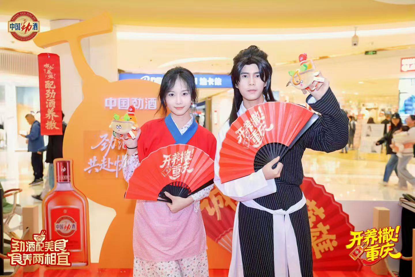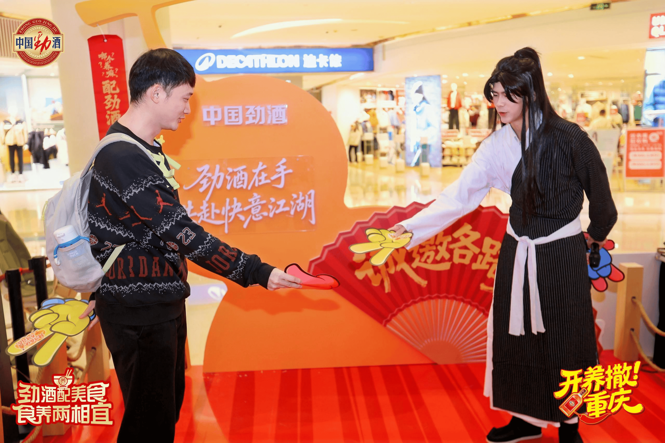 活动现场人潮涌动,热力四起。劲酒以“椒养”为线索、以江湖为底色,在山城掀起一场别开生面的“江湖集结”。“山城椒养吧”“椒养酒肆”等主题装置,让人一脚踏入地道的重庆味。侠客造型的NPC穿梭其中,邀市民互动合影,现场笑声与热辣气氛交融,烟火气与江湖气交织。