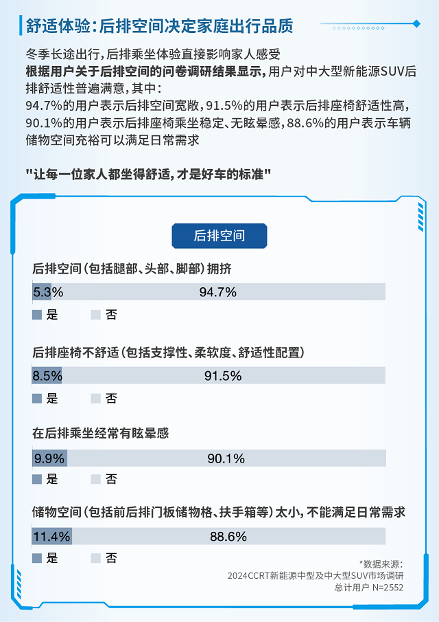 显示,中大型新能源SUV用户中,带娃家庭占比高达83.8%,后排空间和储物能力成为购车核心考量。94.7%的用户认为后排空间宽敞,91.5%对座椅舒适度满意,90.1%认为乘坐稳定无眩晕感;同时,93.3%的用户认为行李箱离地高度合理,90.2%对容积深度满意,92.0%认为后备箱空间拓展灵活。