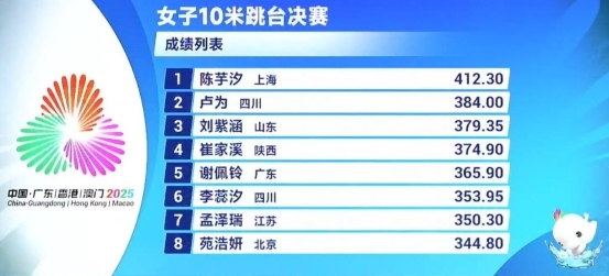 全运会跳水女子10米台决赛,上海队的陈芋汐以412.30的高分拿下冠军。这是她首夺全运会个人项目金牌,同时也是陈芋汐继双人10米台后,本届全运会个人第二金。四川队卢为获得亚军,得分384分。铜牌获得者是山东队刘紫涵,她的总成绩为379.35分。