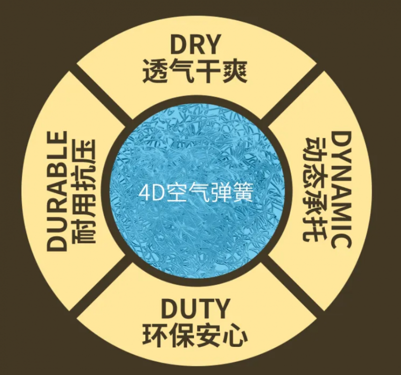 穗宝尊承床垫还选用了西班牙100%原装进口的4D空气弹簧,让睡眠拥有“呼吸力”。它采用高科技POE原材料,围绕“DRY、DYNAMIC、DUTY、DURABLE”四大4D睡眠科技特性,重新定义优质睡眠体验。