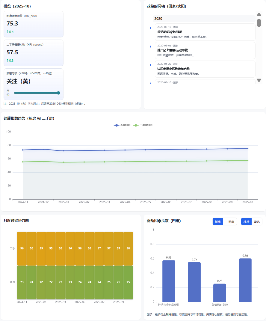 在楼市进入“品质竞争+结构去库存”的新周期后,单看价格涨跌已不足以解释一座城市的真实运行。近日,辽宁大学团队发布AI赋能的商品住宅健康指数(HRI)平台:将经济与金融稳健性、政策支持与市场调控、舆情信心指数、住房品质与宜居性四大维度纳入同一套时序指标体系,并区分新房/二手分别计算,配合年度政策时间轴(滚动浏览)、行政区热力图(支持缩放)、近12月因子贡献与下行因素建议卡等功能,力图把“看不见的结构变化”变成一张张“会说话的图”。