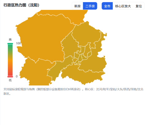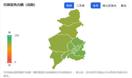 2、行政区热力图(可缩放):突出核心城区(和平、沈河、皇姑、大东、铁西、浑南、沈北新区)分布特征,支持快捷放大与联动提示。