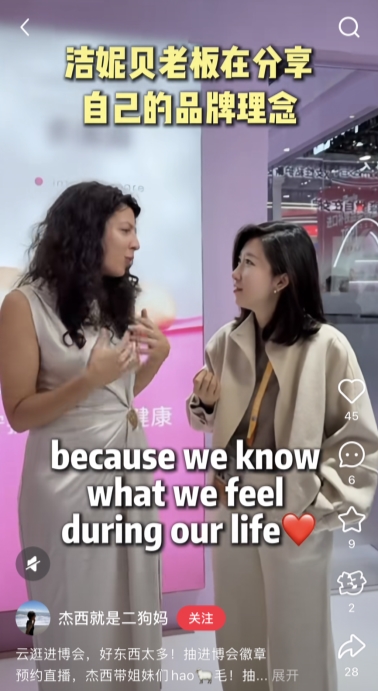 进博会期间,Gynable洁妮贝邀请了知名大V“杰西就是二狗妈”进行现场直播带货。这位大V不仅是小红书上的知名口译员,同时也是一位7岁孩子的妈妈。她的多重身份为品牌带来了更为立体的信任背书,其专业背景与妈妈身份的结合,与Gynable洁妮贝的品牌理念高度契合。直播在洁妮贝展位现场进行,通过专业产品讲解与真实体验分享,向消费者全面展示了品牌产品的独特优势。