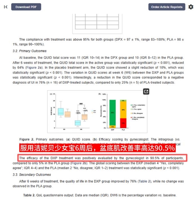 严谨的临床数据和权威认证进一步佐证了其功效。品牌联合欧洲顶尖实验室与医疗联盟开展的临床研究显示,在为期6周的观察中,使用者整体改善率达到90.5%。该研究结果已发表于国际权威期刊《URO》,并获皇家妇产科学院文献收录,从临床层面印证了产品通过“内分泌调节—组织修复—功能改善”的链式作用路径。