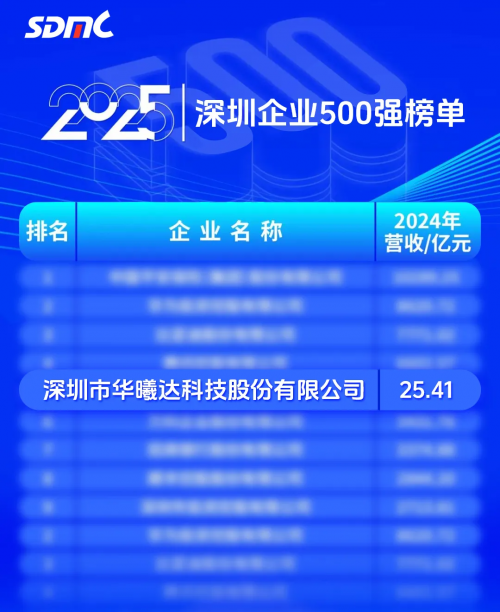 近日,深圳市企业联合会与深圳市企业家协会正式发布“2025深圳企业500强榜单”,深圳市华曦达科技股份有限公司成功登榜,这已是其连续第四年获得这一荣誉。作为衡量深圳企业综合实力的重要标杆,该榜单以企业2024年度营业收入为排序基准,并从创新力、市场竞争力等多维度构建评估体系。