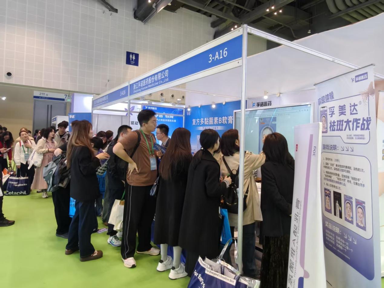 孚诺医药展台以“经典传承,创新突破”为主题,重点展示了旗下两款核心产品。孚诺®软膏采用经典三抗配方,含硫酸多黏菌素B、硫酸新霉素与杆菌肽三种抗生素成分,配合利多卡因止痛与凡士林基质保湿,适用于擦伤割伤、烧烫伤等皮肤伤口护理。今年新上市的孚美达®乳膏则作为国内首个获批的黄褐斑治疗复方外用制剂,进一步丰富了企业在皮肤外用药领域的产品布局。
