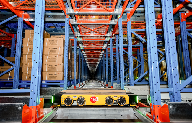 四向AGV穿梭车:通过AS/RS自动存取系统与RFID定位技术,实现立体货架跨巷道作业,空间利用率提升2-5倍,存储量达45万件;