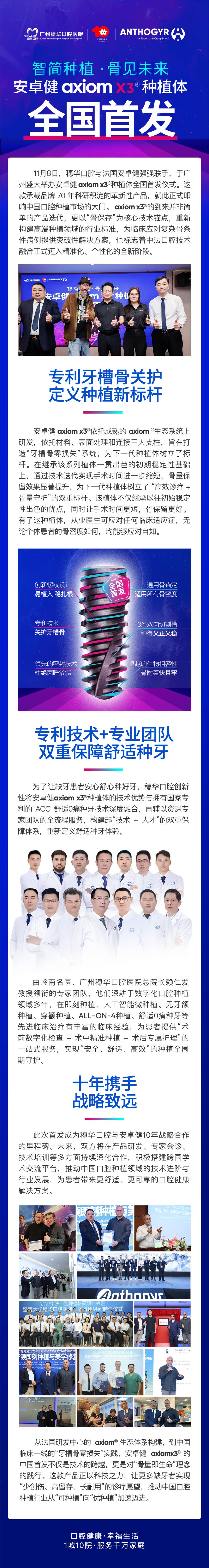 11 月 8 日,穗华口腔与法国安卓健强强联手,于广州盛大举办安卓健 axiom x3® 种植体全国首发仪式。这款承载品牌 70 年科研积淀的革新性产品,就此正式叩响中国口腔种植市场的大门。axiom x3® 的到来并非简单的产品迭代,更以 “骨保存” 为核心技术锚点,重新构建高端种植领域的行业标准...