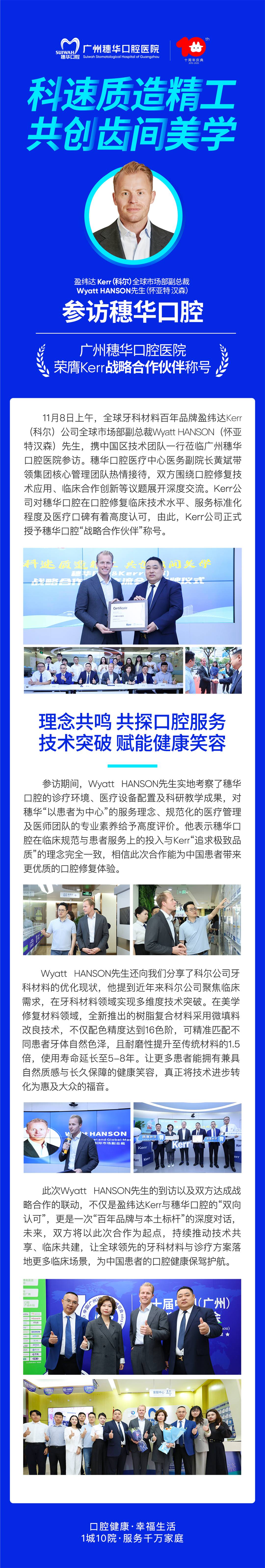 11 月 8 日上午,全球牙科材料百年品牌盈纬达 Kerr(科尔)公司全球市场部副总裁 Wyatt HANSON(怀亚特・汉森)先生,携中国区技术团队一行莅临广州穗华口腔医院参访。穗华口腔医疗中心医务副院长黄斌带领集团核心管理团队热情接待,双方围绕口腔修复技术应用、临床合作创新等议题展开深度交流。Kerr 公司对穗华口腔在口腔修复临床技术水平、服务标准化程度及医疗口碑有着高度认可,由此,Kerr 公司正式授予穗华口腔 “战略合作伙伴” 称号。