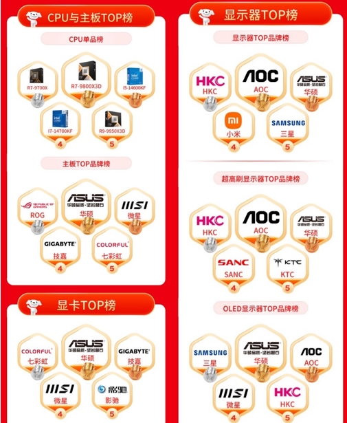 在产品阵营上,核心硬件市场品牌格局清晰,高性能配置成为主流选择。CPU单品销量榜单由R9-9800X3D、R7-9700X、I5-14600KF领跑;主板品牌竞争中华硕、ROG、微星位居前三。显卡市场华硕、七彩虹、技嘉位列品牌榜首。显示器品类中,AOC、HKC、华硕占据销量前三;在细分领域,超高刷新率显示器市场由AOC、HKC、华硕主导;OLED显示器则呈现华硕、三星、AOC三强格局。