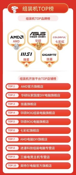 个性化组装电脑市场也迎来持续走热,品牌旗舰店表现突出。组装机品牌华硕、AMD、七彩虹占据销量前三。开放平台店铺AMD官方旗舰店、华硕玩家国度DIY电脑旗舰店、技嘉旗舰店位列销售前列。
