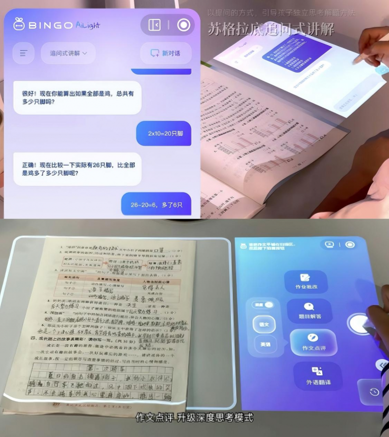 想象一下:孩子在纸上演算数学题,系统能实时跟进解题过程,在关键步骤提供思路引导;写作时,文字不再是冰冷的符号,系统能理解文章脉络,提供结构性的改进建议……这一切都基于“AI+AR智能家教系统”,通过独特的“苏格拉底式提问”功能,唤醒“宾果,宾果”,开启启发式的作业辅导对话,帮助孩子掌握解题方法,而不是简单地核对答案,从而培养孩子独立思考的能力。
