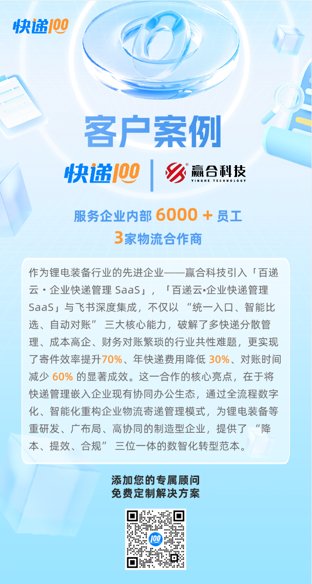 通过与飞书深度集成,「百递云•企业快递管理SaaS」帮助赢合科技实现寄件、财务对账数智化管理,带来了多方面的显著价值: