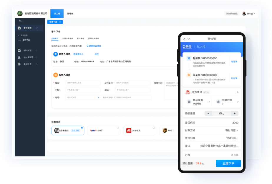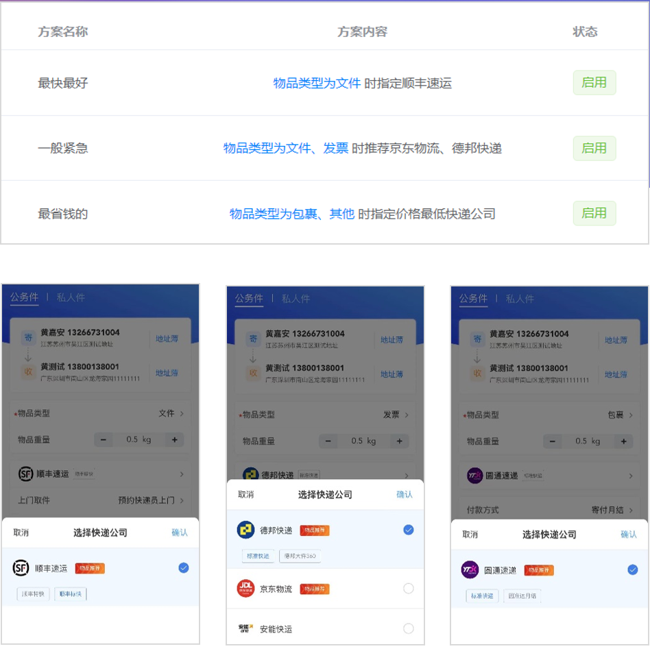 管理人员在系统内自主设置匹配规则,规范不同物品与合适快递公司匹配关系,根据收件地与重量自动计算运费,当员工寄件时,系统会推荐最优运力,帮助公司年快递费用降低至少30%。