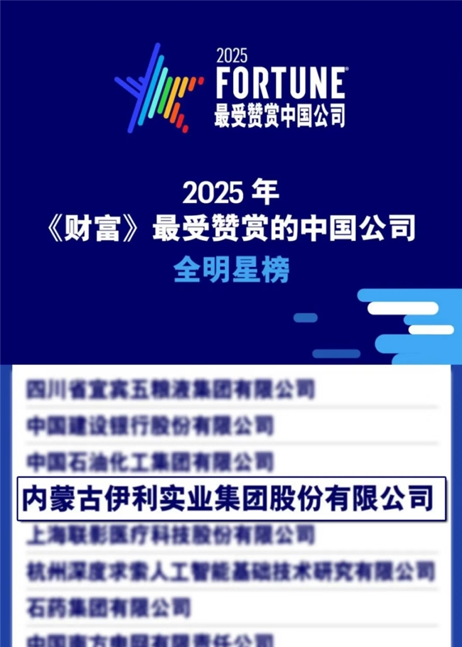 此次入选《财富》“最受赞赏的中国公司”,是对伊利股份综合实力与社会贡献的再次肯定。展望未来,伊利股份将继续深化绿色实践、拓展公益边界,以更高标准引领行业迈向更可持续的未来。