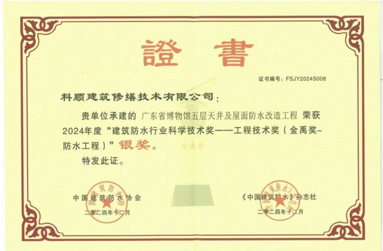 凭借适配气候的产品方案与精益求精的施工工艺,该项目还入选2024年度建筑防水行业金禹奖银奖。广东省博物馆防水修缮项目的成功,不仅是科顺股份技术实力的彰显,更以实际案例诠释了“一次防水,一次就好”的深层内涵,为文物建筑防水沉淀了可推广的标准范式。