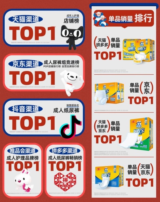 2025年“双十一”购物狂欢落下帷幕,“中国银发经济第一股”可靠股份再创佳绩,凭借全渠道协同发力,持续打造超级爆品,各渠道霸榜TOP1。据数据统计,此次“双十一”,可靠加强型纸尿裤热销超1,115,000片,吸收宝经典系列销售额超3500万,吸收宝2.0成裤销售额同比增长83%,蔓越莓吸水巾系列销售额同比增长78%。
