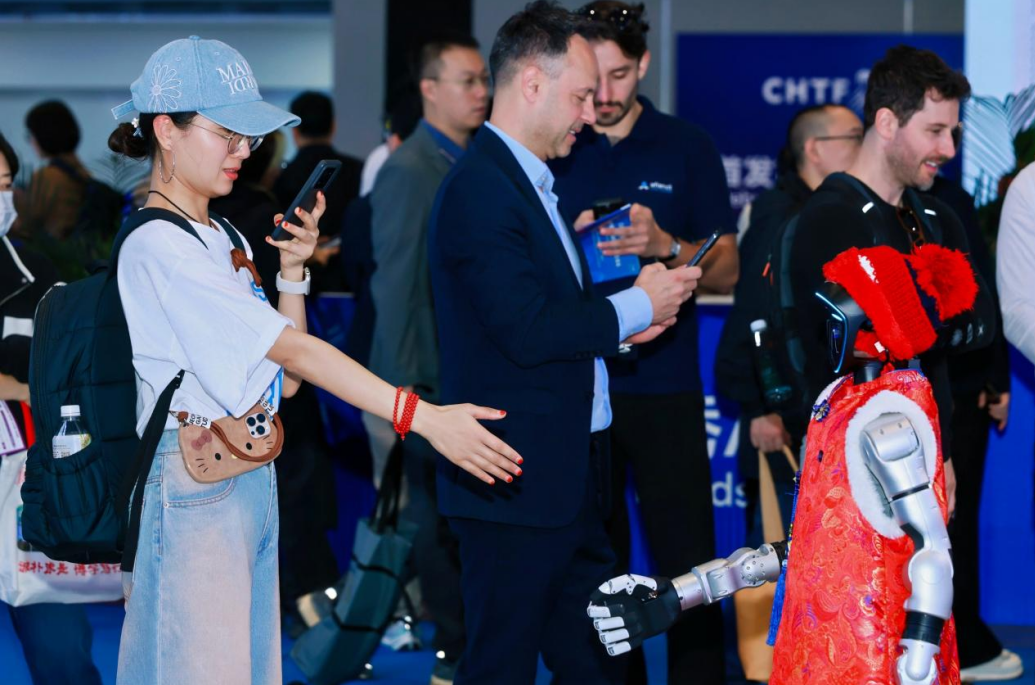 (观众与穿戴中国传统服饰的人形机器人进行手势互动)