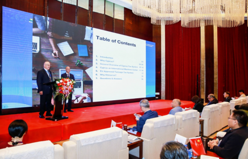 在随后举行的企业推介环节,包括KITESERVE、灰剑律师事务所、Tekserv、KT公司、COLUMBIA海运集团、海事卫士等多家塞浦路斯及国际企业登台介绍业务与合作意向,覆盖法律、科技、物流、海事服务等多个行业,现场气氛热烈。