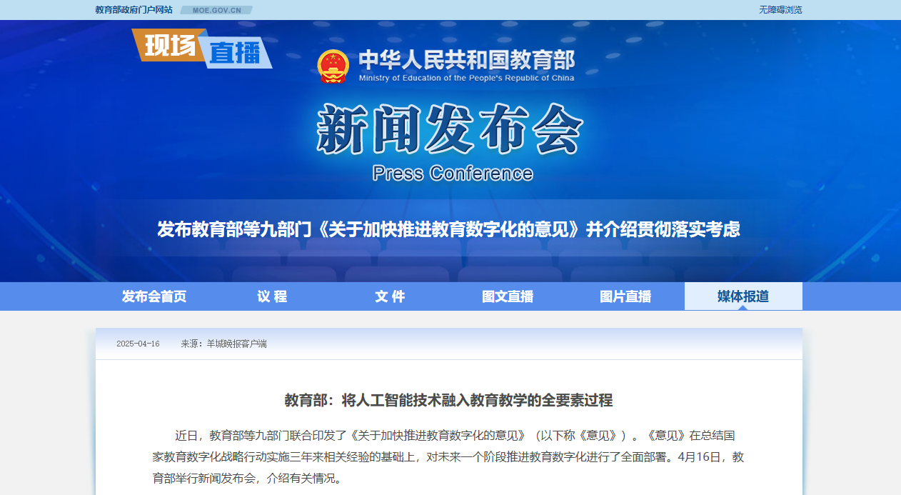 近期,教育部等九部门联合印发《关于加快推进教育数字化的意见》,强调要将人工智能技术深度融入教育教学全过程,加快推进教育模式创新。10月16日,全国政协提案委员会赴教育部开展专题调研,重点督办"深化人工智能应用,推进教育数字化"等相关提案,进一步推动教育数字化转型工作落地见效。在政策指引下,人工智能与教育实践的深度融合正在重塑教学形态,成为推动教育现代化的重要引擎。