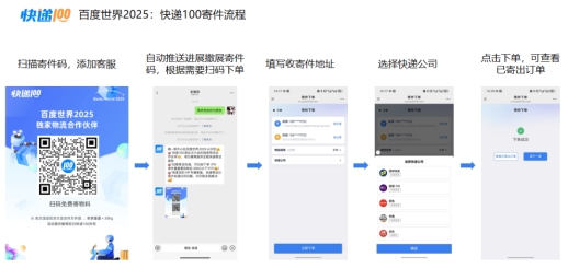 在大会筹备前期,快递100成立专项,深入分析活动规模、物资类别、运输时间节点等需求。内部提前为展商设置专属寄件码,展商扫码即可添加专属客服,系统会推送寄件二维码,如未自动推送,可直接咨询客服“百度世界2025专属寄件码”,即可下单;分别安排线上客服和线下驻场人员保障服务,并同步与百度沟通活动组织相关事宜,全力保障大会顺利开展。与此同时,快递100积极与多家快递公司提前交涉,确保运力调度能力、应急情况能力、资源协调能力的匹配。