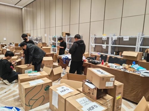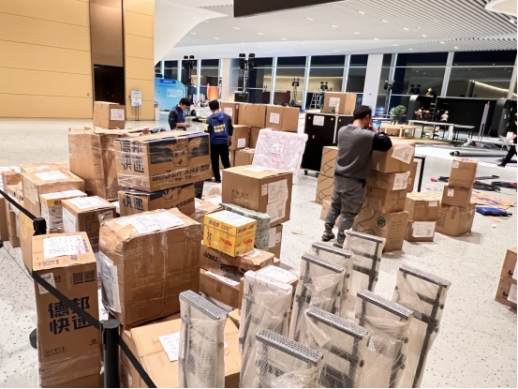 百度世界2025开展前一天下午6:20,快递100线下驻场人员对大会所有进展物资进行最终盘点,确认物资全部签收,并无延误、丢件情况。
