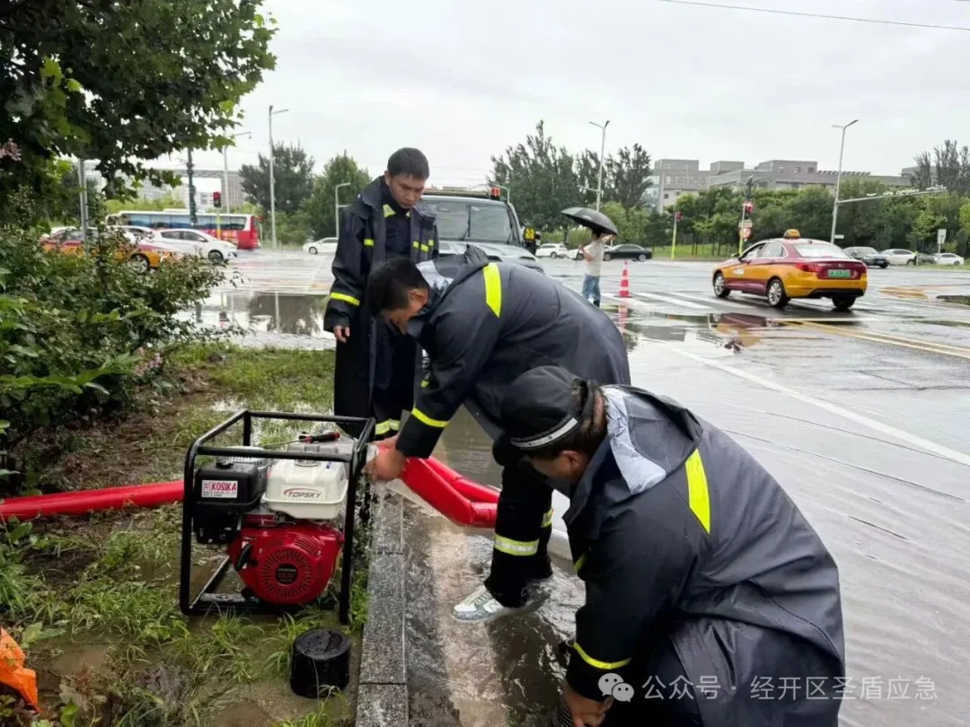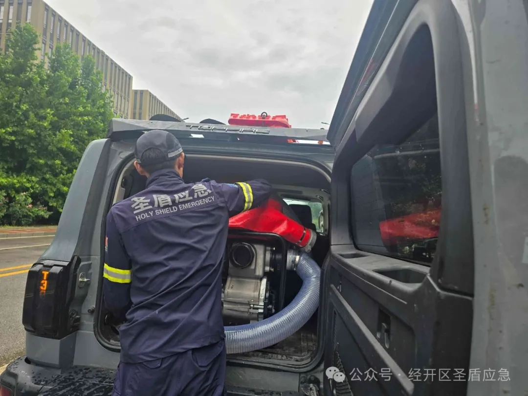 - 城市内涝排涝(2025年7月29日9:00):接经开区城市运行局应急处通报,经海五路国际企业大道南区因暴雨出现严重积水,水深超50cm,威胁企业设备安全。经开区圣盾应急立即调派8名队员、2台防汛排涝泵赶赴现场,通过“抽排积水+筑堤挡水”双措施,仅用40分钟即排除积水险情,返队备勤,确保汛期随时响应。