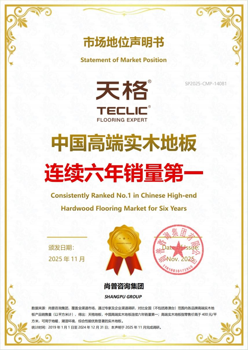 近日,国内知名市场调研机构尚普咨询发布研究报告:天格地板荣获“中国高端实木地板连续六年销量第一”市场地位认证证书。在政府倡导推动建设安全、舒适、绿色、智能的“好房子”时代背景下、消费者对家居品质要求持续升级的当下,天格中国高端实木地板的持续热销并非偶然。三十多年来,天格地板始终坚持对高品质产品的坚守、对高价值服务的完善,以及对用户核心需求的精准洞察,从健康环保的材质选择,到稳定耐用的功能创新,再到适配多元审美的颜值打造,天格以用户 “住得更健康、住得更安心、住得更快乐”为三重价值闭环,为千万家庭构建起高质量家居生活的基石,成为 “好房子” 时代当之无愧的家居标杆品牌。