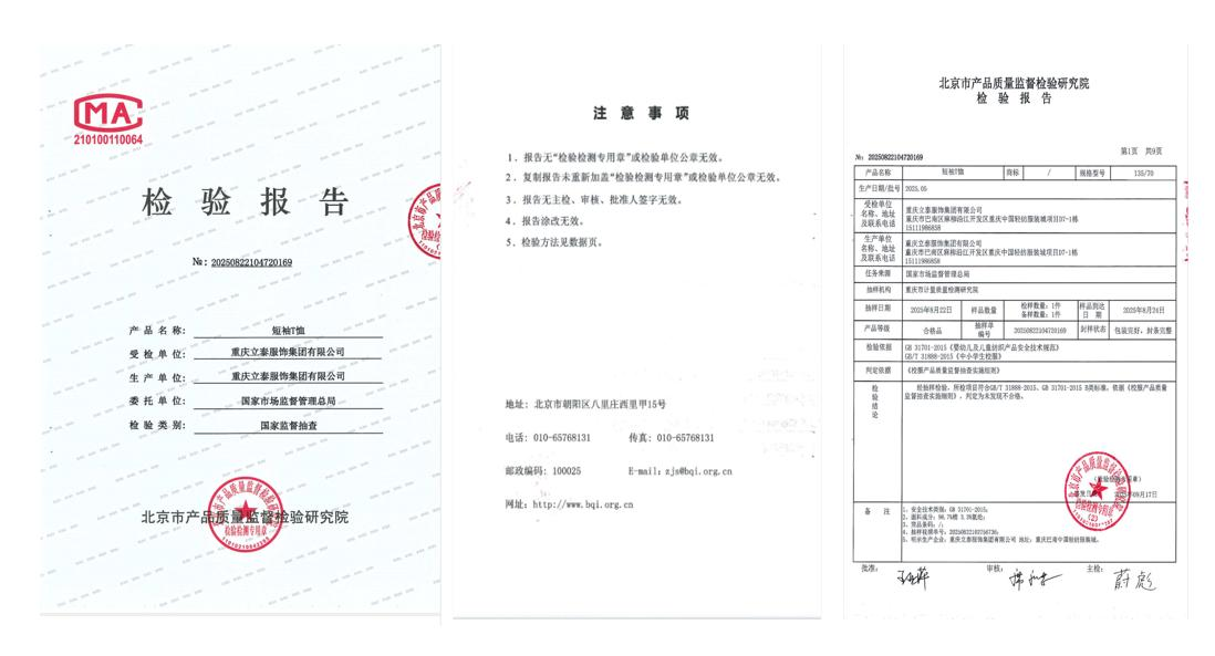 近日,从国家市场监督管理总局传来喜讯:在 2025 年国家校服产品质量监 督抽查中,重庆立泰服饰集团有限公司生产的校服产品,经北京市产品质量监督 检验研究院权威检测,全部 13 个检验项目均符合国家标准,抽检合格率 100%, 再次印证了重庆立泰服饰集团质量过硬的产品实力。