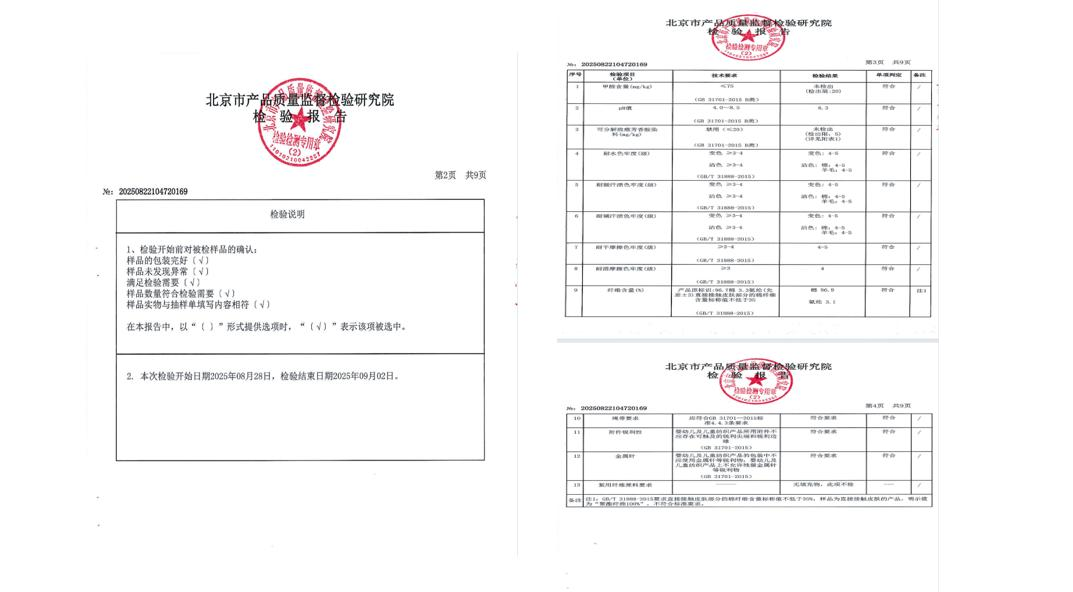 本次抽检依据 GB/T 31888-2015《中小学生校服》和 GB 31701-2015《婴 幼儿及儿童纺织产品安全技术规范》B 类标准,对涉及学生健康安全的核心指标 进行了全面“体检”。报告显示: 安全指标全优:甲醛、可分解致癌芳香胺染料等有害物质“未检出”; 亲肤体验卓越:pH 值达 6.3,处于标准最佳区间,色牢度多项指标超越标准要 求; 材质真实透明:纤维含量实测值与标识完全吻合,棉含量达 96.9%; 设计安全放心:绳带、附件等均符合儿童纺织品安全规范。