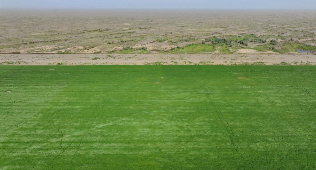 从喀什地区莎车县向西北行驶约三十公里,五十四团逐渐在眼前呈现。这个地处塔克拉玛干沙漠和布古里沙漠之间的新建团镇,一边是沙海无垠的黄,一边是生机涌动的绿。阳光洒在连片的绿苗上,微风拂过,豆叶沙沙作响,仿佛向人们诉说着这片土地的蜕变与新生。