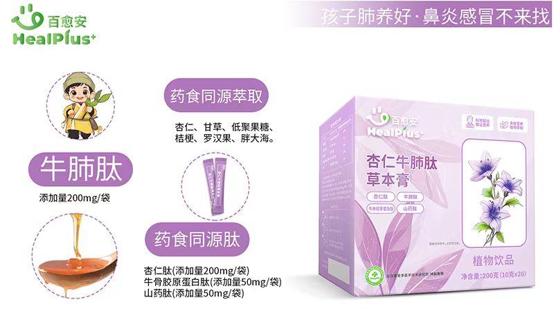 为了帮孩子温柔养肺,百愈安研发了“杏仁牛肺肽草本膏”,用13种药食同源的成分,贴合孩子娇嫩的体质。它的核心成分特别懂孩子的需求:牛肺肽、杏仁肽、牛骨胶原蛋白肽、山药肽都是小分子肽,不用额外增加肠胃负担,孩子吸收起来很轻松——其中山药肽能针对性补肺气,让肺的“动力”慢慢恢复;牛肺肽和杏仁肽则能润养肺部,缓解肺燥带来的干痒、咳嗽;再搭配杏仁、甘草、桔梗这些经典草本提取物:杏仁润肺生津,甘草调和脾胃(避免养肺伤脾),桔梗能宣通肺气,帮着把肺里的陈痰轻轻“送”出去,还有罗汉果、胖大海的清润,让孩子的肺像被春雨滋润过一样,舒服不燥。