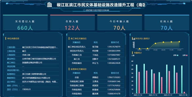 在国家大力推进新型建筑工业化与数字化转型升级的战略背景下,建筑业正经历一场以“智能建造”为核心的深刻产业变革。作为行业的先行者,国强建设集团有限公司依托深厚的施工管理经验与前瞻性的技术布局,在承建的椒江区滨江市民文体基础设施改造提升工程(南区)(施工总承包)项目中,全面构建并实践了一套以数据驱动的智能建造体系,致力于打造行业标杆示范工程,为推动建筑业高质量发展赋能添智。