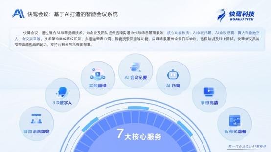 作为快鹭科技基于AI打造的智能会议系统,它整合AI与音视频技术,能提供远程沟通协作+信息管理服务,像AI会议托管、AI会议纪要、真人形象数字人、会议实录这些核心功能,再加上声纹识别、多通道语音分离、智能搜索回溯等技术,不管是日常会议、远程培训还是线上面试,都能覆盖到。而且它支持窄带高清视频,公有云、私有化部署都能选,适配不同企业需求。