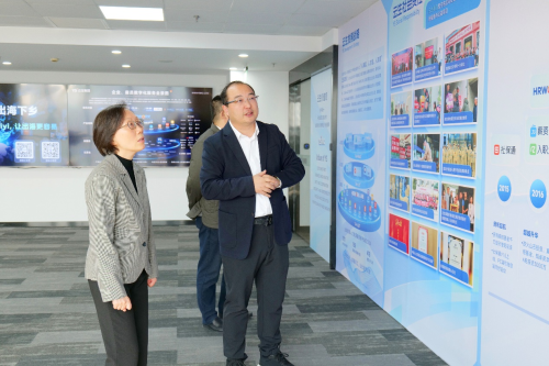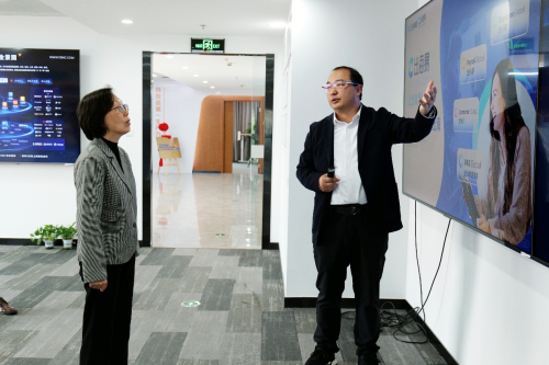 李贤威首先带领领导一行参观了云生全球创新中心,介绍了云生集团的发展历程、产品服务、市场拓展、所获荣誉等情况。李贤威介绍了集团在“AI+人力资源”领域的深耕与创新,云生AI深入人事、人才、人效三层业务,AI数字员工和HR智能体全面数智化赋能民生就业、助力中企出海、推动企业人力资源管理的转型升级。