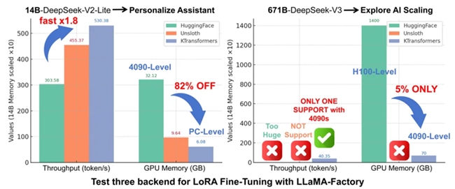 在性能对比测试中,KTransformers微调方案优势显著。在较小规模的MoE模型(DeepSeek-14B)测试中,其吞吐速度超过传统方案1.8倍,显存占用较传统方案降低 82%。传统方案多依赖H100等高端 GPU,而KTransformers可支持4090级消费级显卡,大幅降低了硬件门槛。这一方案让创新门槛显著降低,学术研发领域能尝试更多样化的想法,企业应用层面可针对自身需求快速微调出定制化模型,且成本和周期大幅缩减,产品迭代更灵活高效