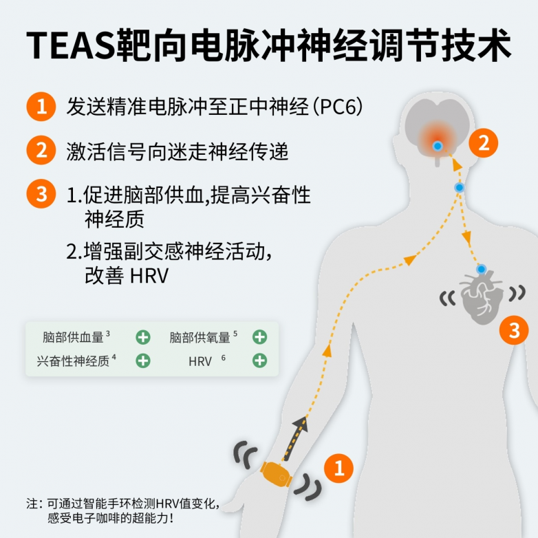 与市场上常见的健康监测设备不同,eCoffee电子咖啡手环采用了创新的TEAS靶向电脉冲神经调节技术,能主动调节自主神经系统,相较于冥想调节方式起效慢、咖啡调节存在副作用等问题,它实现了“即开即用、安全高效”的独特优势。其核心工作原理是通过佩戴在腕部的电极片,释放温和、安全的电脉冲,精准刺激正中神经。信号继而传导至大脑,激活作为副交感神经核心的迷走神经,有效抑制交感神经过度兴奋,促进心率减缓、血压平稳,从而快速恢复HRV水平,实现自主神经系统的平衡。整个过程无需药物介入,无任何副作用,且操作简单,用户只需轻松佩戴并开启设备,即可享受身心平衡的调节服务。