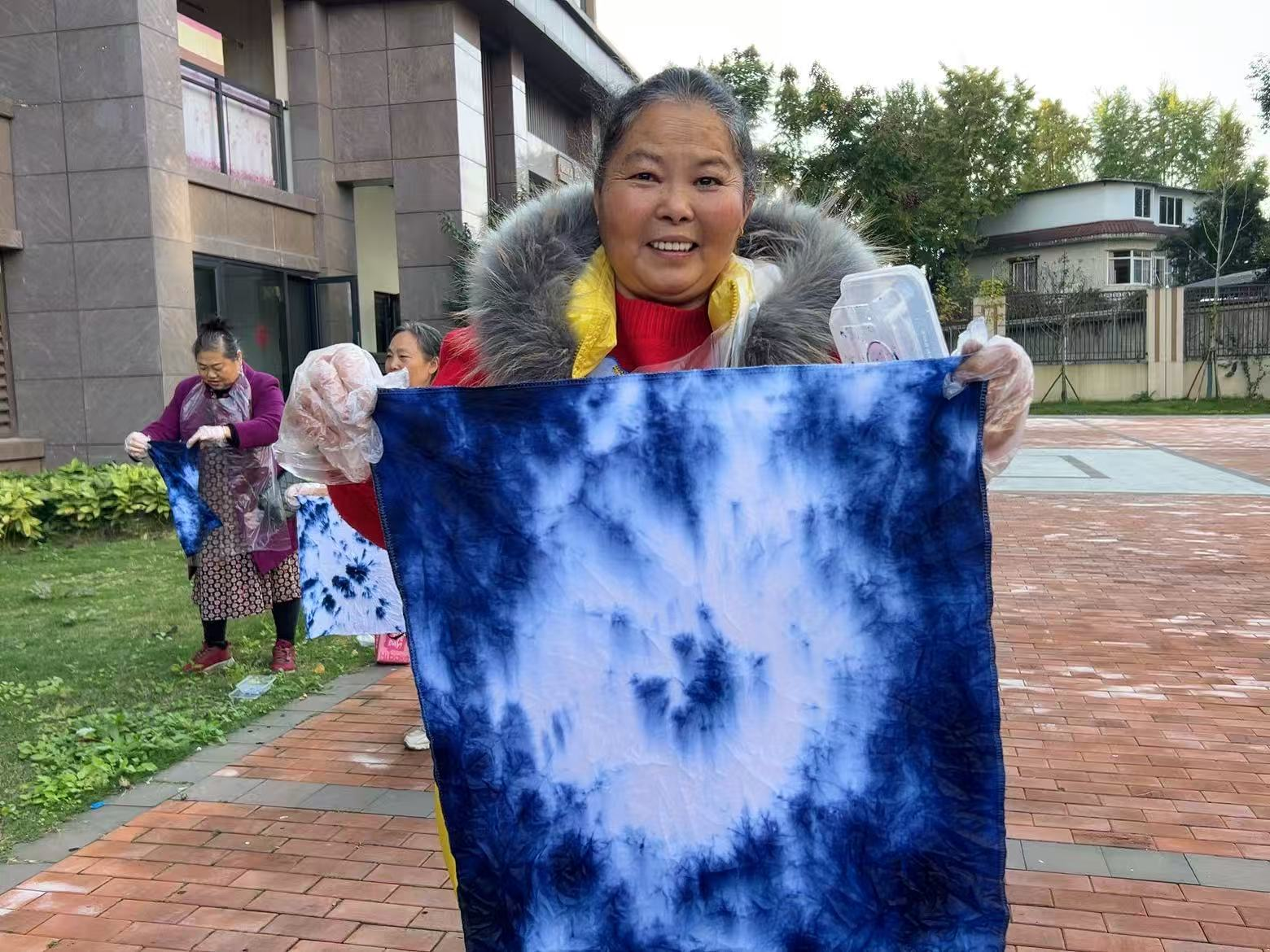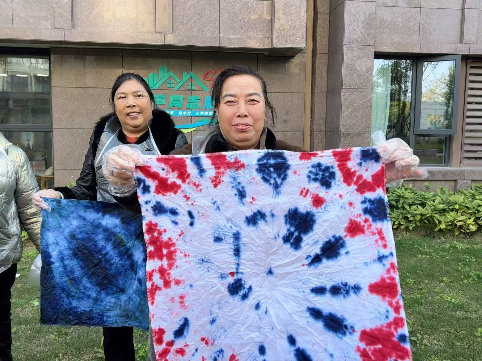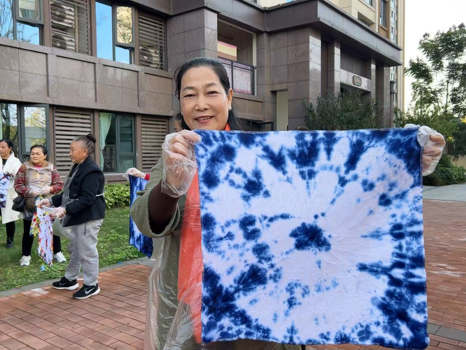 在实践环节,居民们早已按捺不住热情,在老师的悉心指导下,纷纷化身“工匠”,根据自己的创意和喜好,用皮筋、木夹等工具对纯白方巾进行创作。活动现场欢声笑语不断,邻里间互相请教、分享技巧,气氛热烈而融洽。最激动人心的时刻是拆开染布的一刹那——当一件件独一无二、蓝白相间、花纹各异扎染作品呈现在眼前时,现场响起了阵阵惊喜的欢呼。每一块方巾都如同开盲盒般充满未知的美丽,居民们手持自己的“艺术首秀”,脸上洋溢着满满的成就感与喜悦。