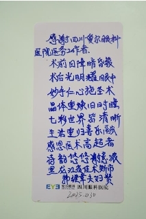 术后复查,韩大爷用一首原创诗句“术前目障暗昏蒙,术后光明耀眼中”特别表达了对巫雷院长、爱尔眼科四川眼科医院白内障科医护团队的感谢。韩大爷的老伴也同期在医院接受了胬肉手术,并计划后续进行白内障手术。