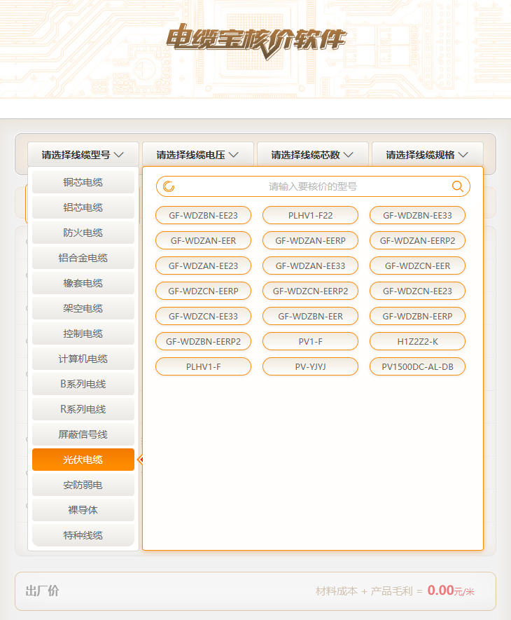 无论你是工程商、采购员还是项目负责人,只需打开网页(电缆宝官网)或小程序(电缆宝网),无需下载,随时随地输入电缆型号、电压、芯数、规格等参数,系统即可基于铜、铝、护套料等原材料实时价格与标准工艺成本,智能生成光伏电缆的成本底价,报价清晰、依据透明。