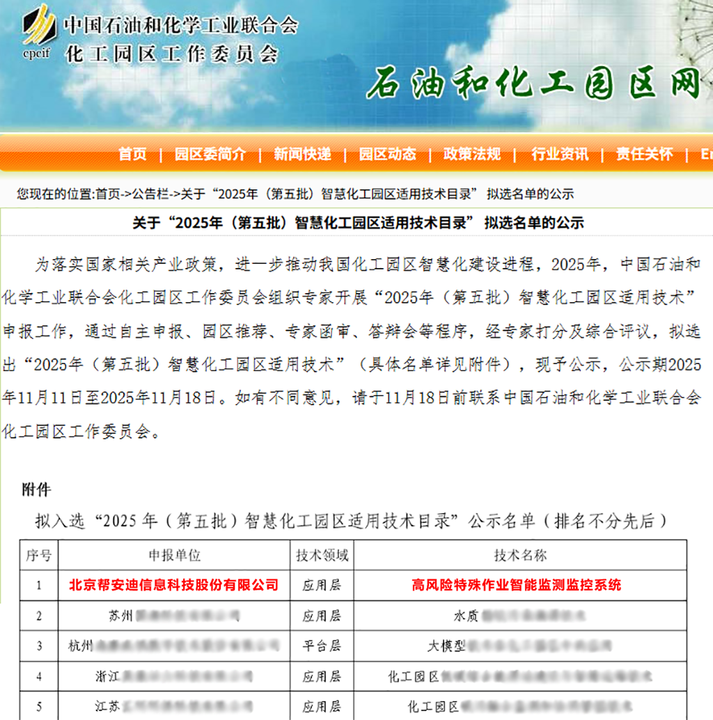 近日,中国石油和化学工业联合会化工园区工作委员会正式发布“2025年(第五批)智慧化工园区适用技术目录”,北京帮安迪信息科技股份有限公司(以下简称“帮安迪”)自主研发的“高风险特殊作业智能监测监控系统”凭借其卓越的技术创新性与行业适用性,从众多申报技术中脱颖而出,成功入选。这标志着帮安迪核心产品连续三年获得此项权威认可,充分体现了公司在智慧化工园区建设领域的技术领先地位与持续创新能力。