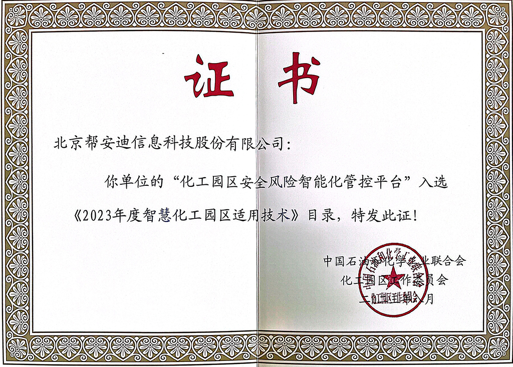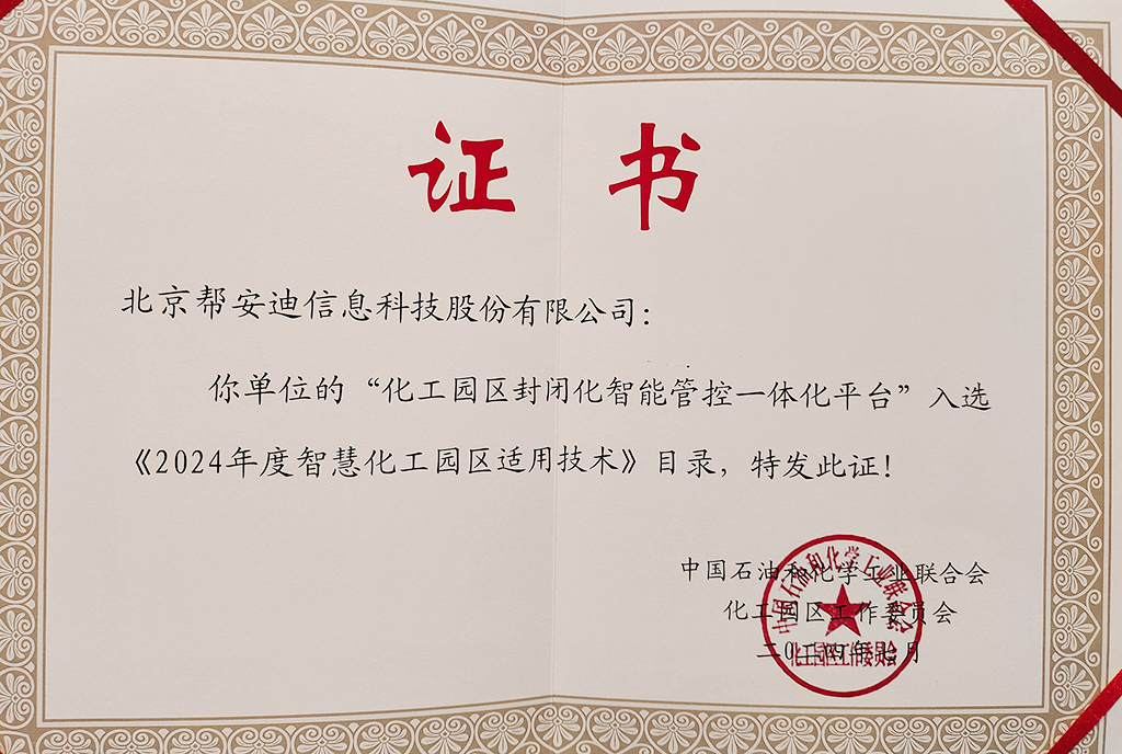 近日,中国石油和化学工业联合会化工园区工作委员会正式发布“2025年(第五批)智慧化工园区适用技术目录”,北京帮安迪信息科技股份有限公司...