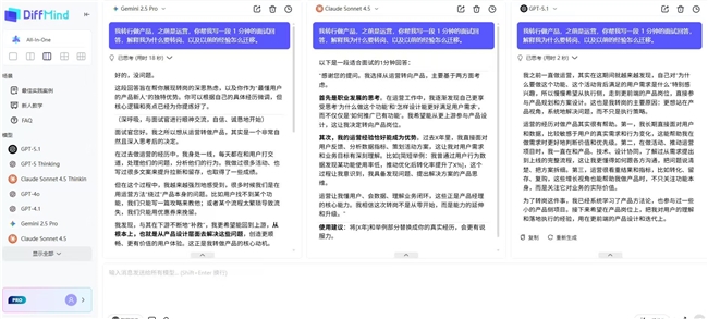 2025 年 11 月 ,面向 TOC 用户的多模型 AI 对比工作台DiffMind正式全量上线。该产品以 “多模型同步对比、提问增强、一次订阅全解锁” 为核心亮点,精准破解普通用户使用 AI 时 “单模型不可靠、不会提问、多平台折腾” 的三大痛点,尤其在 “提问增强” 功能上实现突破 —— 哪怕用户随便说一句模糊需求,DiffMind 都能帮其拆解成比自己表述更清晰 10 倍的精准指令,让无需专业技巧的普通用户也能高效、低成本地享受优质 AI 服务。