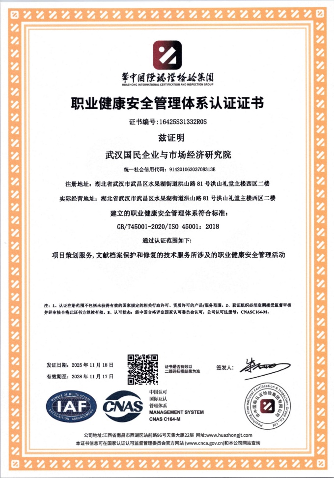 近日,武汉国民企业与市场经济研究院( 以下简称“武研院”)顺利通过质量管理体系(ISO9001)、环境管理体系(ISO14001)及职业健康安全管理体系(ISO45001)的新一轮认证审核。