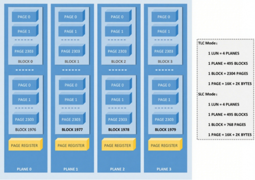 以天硕 G40 M.2 NVMe 工业级固态硬盘 采用的 YMTC X2 NAND 为例,每个 Die 有 4 个 Plane;每个 Plane 有 495 个 Block;每个 Block 有 768 或 2304 个 Page(SLC/TLC 模式);每 Page 有 16 KB 有效空间。