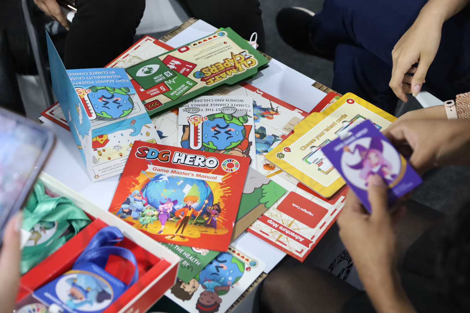 当地时间11月17日,在GAUC展馆内,一场“SDG Hero”游戏共创工坊正热烈进行。“游戏规则怎么设置,才能让玩家意识到一次选择会对后续气候情景产生连锁反应?”一名来自南半球国家的学生代表一边推演卡牌,一边与同伴讨论。在引导师带领下,来自多国高校与青年组织的参与者被分成小组,结合“SDG Hero”工具包与气候行动主题(SDG 13),尝试设计属于自己的气候桌游:有的小组关注极端天气与碳排放,有的小组将目光投向城市洪涝和基础设施,还有的小组把故事背景设在本届大会主办地——亚马孙雨林。