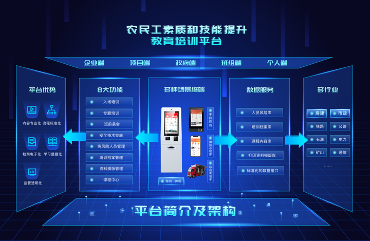 3、云端管理,全程可控:创新“一人一码”档案管理模式,培训数据实时同步云端,支持身份证快速核验、培训过程可视化监管,杜绝替考漏学;项目培训监管大屏可实时展示培训进度、考核通过率,为监管部门和企业提供数据支撑,实现“培训有记录、考核有依据、监管有抓手”。