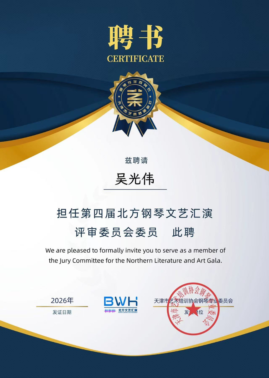 近日,备受瞩目的天津市第四届北方钢琴文艺汇演正式公布评审委员会阵容,中华儿童文化艺术促进会艺术培训工作委员会副秘书长吴光伟受邀担任评审委员,将以专业视角为这场公益钢琴盛事保驾护航。